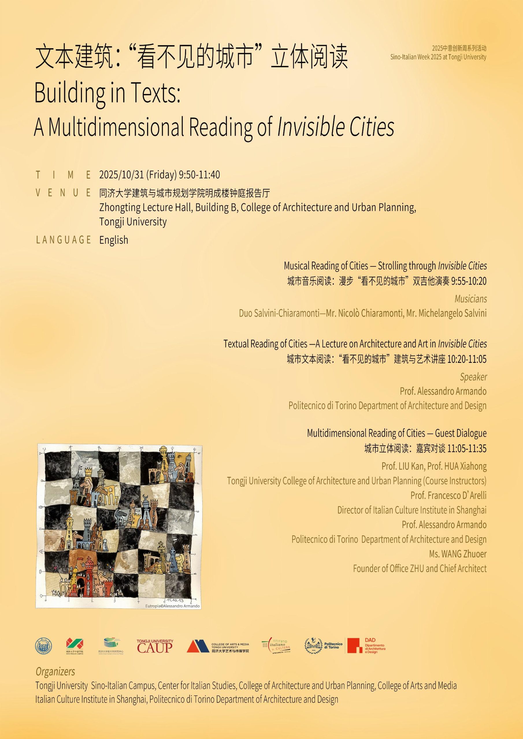 L’Istituto Italiano di Cultura di Shanghai è lieto di presentare la conferenza Textual reading of Cities. A Lecture on Architecture and Art in Invisible Cities del Professor Alessandro Armando, celebre architetto e pittore di Torino, nonché autore dei cinquantesei acquerelli del volume celebrativo Marco Polo. Le novità e le cose inusitate. L’evento, organizzato in collaborazione tra l’Istituto, il Dipartimento di Architettura e Design del Politecnico di Torino e Tongji University, si tiene al College of Architecture and Urban Planning di Tongji University (Shanghai) il 31 ottobre 2025.