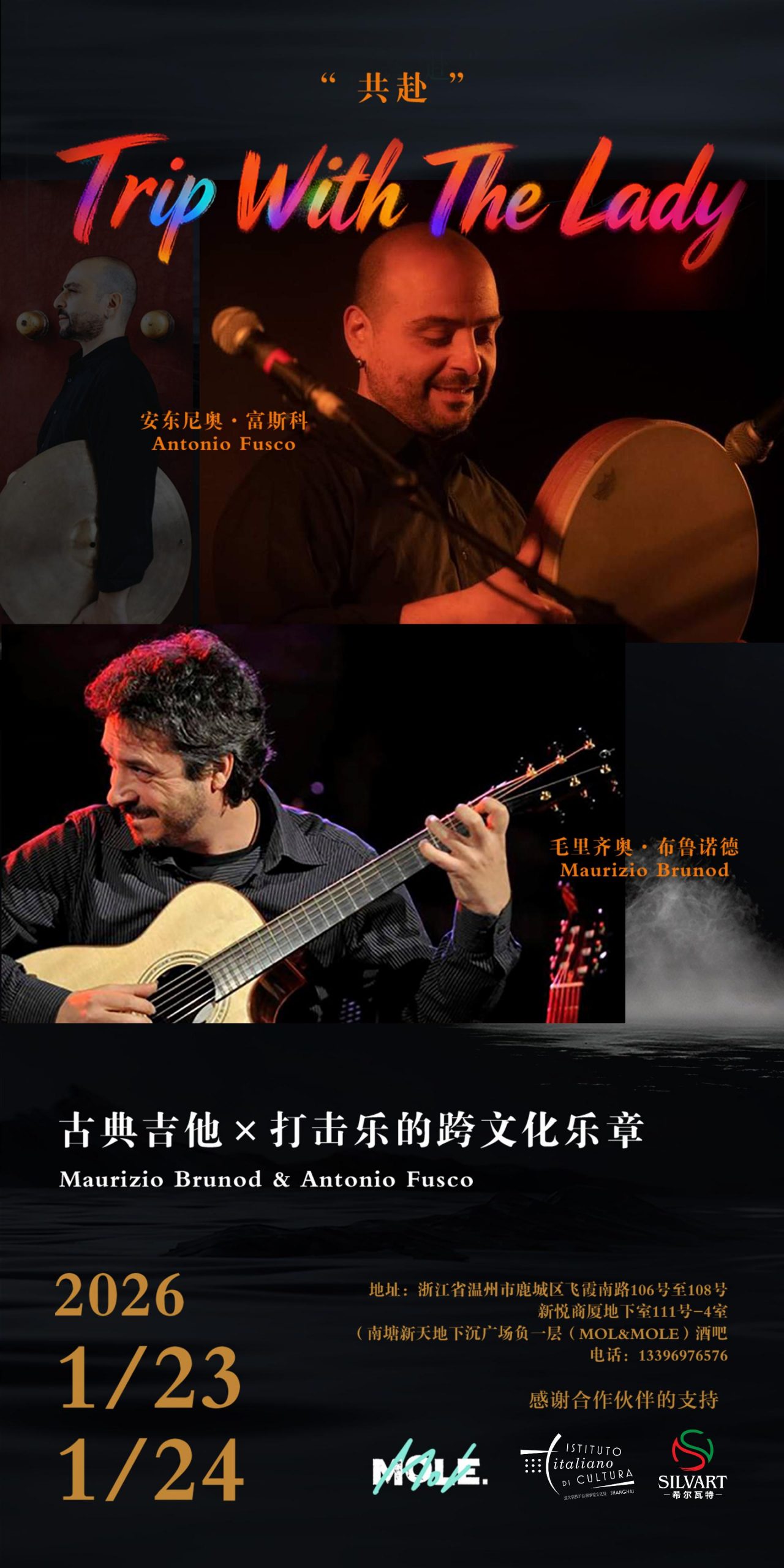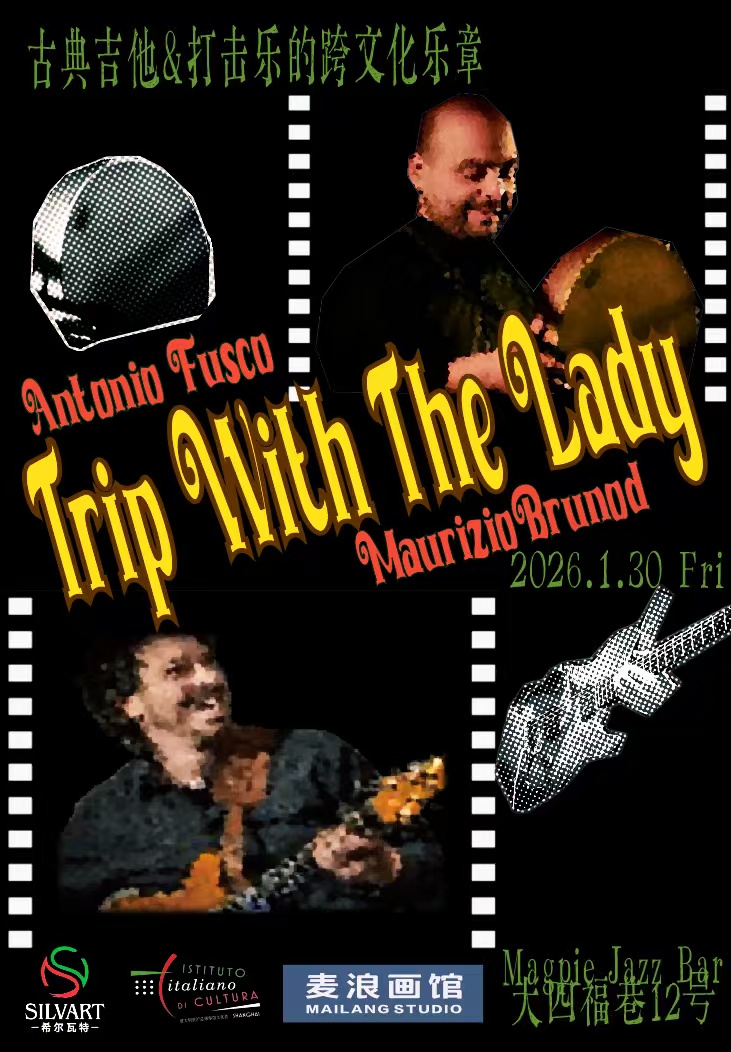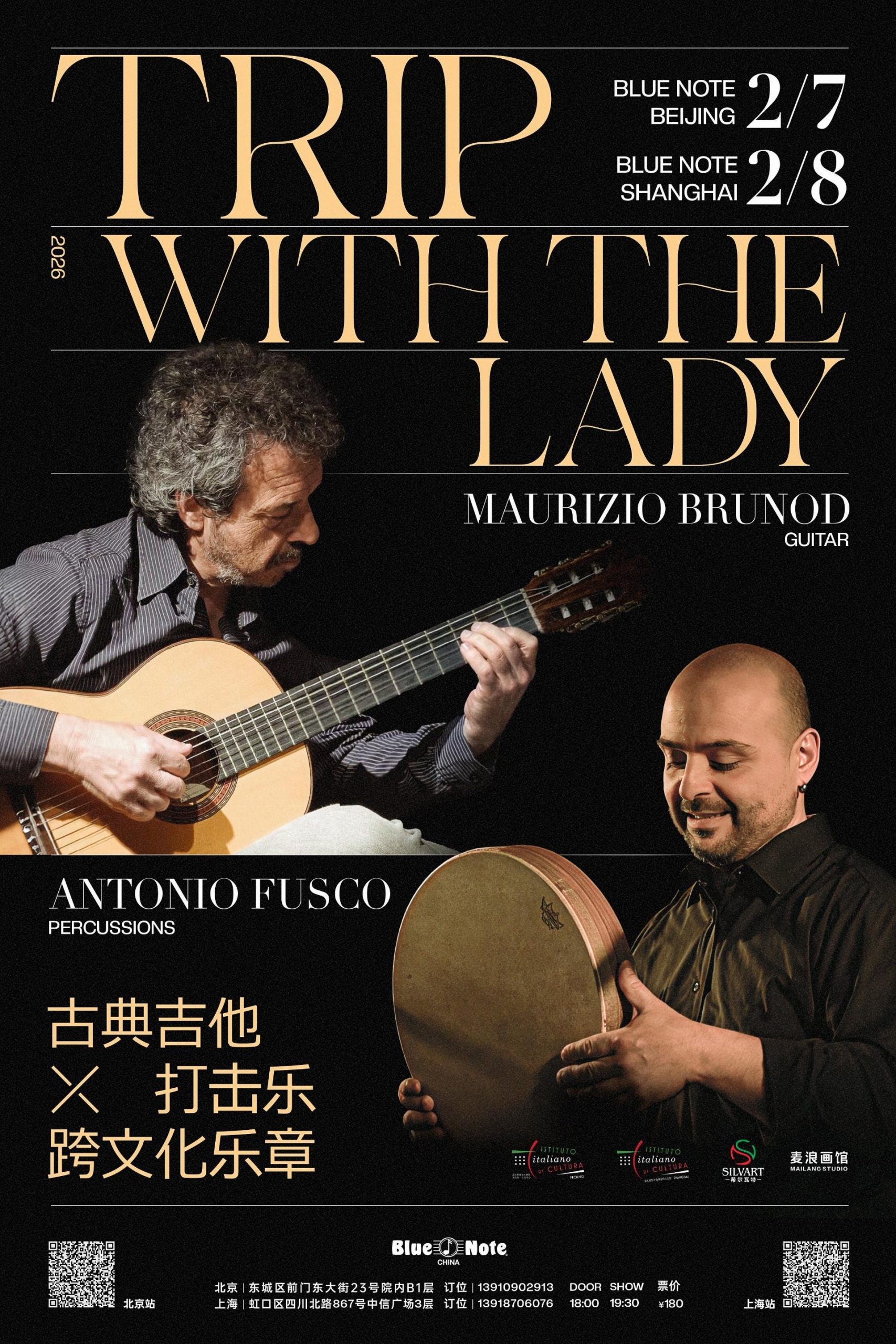 L’Istituto Italiano di Cultura di Shanghai è lieto di presentare la tourneé Trip with The Lady di Maurizio Brunod e Antonio Fusco. La tournée è composta di quattro tappe, le quali si terranno rispettivamente al Mol&Mole di Wenzhou nei giorni 23 e 24 gennaio 2026, al Magpie Jazz Bar di Nanchino il 30 gennaio 2026, al JZ Club di Hangzhou l’1 febbraio 2026 e al Blue Note Shanghai l’8 febbraio 2026. Il progetto è realizzato con il sostegno dell’Istituto Italiano di Cultura di Shanghai.