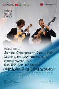 意大利驻沪总领事馆文化处携手浙江音乐学院,欣然呈现萨尔维尼-基亚拉蒙蒂二重奏大师班,题为“阿尔瓦罗·康帕尼:二十世纪最具影响力的吉他人物之一——作品、教学、遗产、双吉他曲目及作品24号《一幅图像(致敬舒伯特)》解析”。本次活动由意大利驻沪总领事馆文化处支持,将于2025年10月29日在浙江音乐学院举行。 继“伊塔洛·卡尔维诺《看不见的城市》音乐”音乐会之后,两位吉他手米开朗基罗·萨尔维尼与尼科洛·基亚拉蒙蒂将向杭州观众分享他们的音乐经验与热忱。从阿尔瓦罗·康帕尼的创作出发,二重奏深入挖掘浪漫主义音乐的音调与现代音乐语言,聚焦于吉他的强大表现力——这件乐器能够诠释甜美而沉思的旋律、情感风景以及富有层次的和声。两位大师还将探讨吉他手的演奏技巧,其细腻之处对于传达并捕捉作品中的浪漫精髓至关重要。 萨尔维尼–基亚拉蒙蒂二重奏 2024年2月,音乐家米开朗基罗·萨尔维尼与尼科洛·基亚拉蒙蒂以吉他二重奏形式首次登台,在“达·芬奇:美丽与创造”展览(利沃诺市博物馆,意大利)上举办了一场完全基于文艺复兴时期双琉特琴曲目的音乐会。自那时起,萨尔维尼-基亚拉蒙蒂二重奏在托斯卡纳地区开启了密集的音乐会活动,致力于呈现双吉他曲目中的经典作品。2025年7月,他们的首张音乐专辑录制完成,于2025年10月10日发行,名为《看不见的城市:乔治·米尔托的双吉他音乐》,是一张收录都灵作曲家乔治·米尔托双吉他作品的双CD专辑,所有曲目均为首次录音。